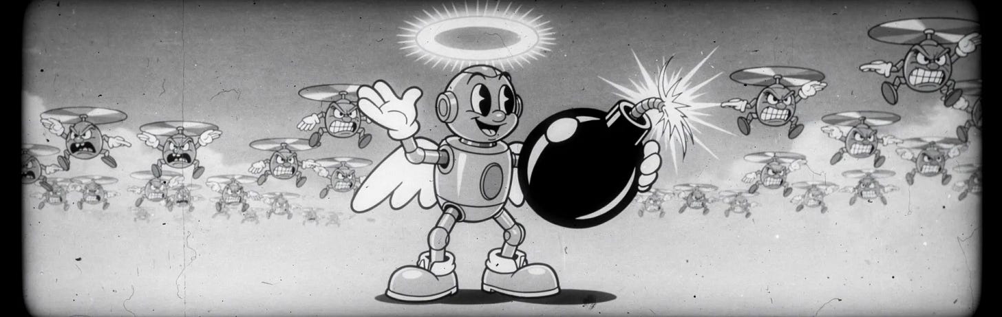 This week’s image aesthetic (Flux 2 Pro): 1930s Rubber Hose Animation (The "Cuphead / Max Fleischer" Look)