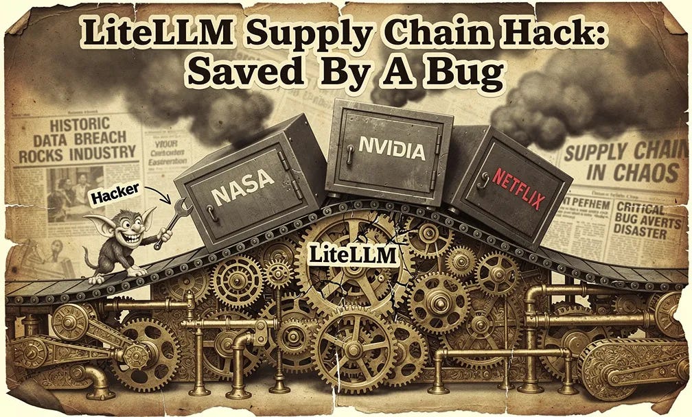 On March 24, 2026, a hacking group successfully compromised a massively popular piece of software called LiteLLM. Think of LiteLLM as a digital master keychain: it holds the passwords and access keys that major organisations like NASA, Netflix, and Nvidia use to connect to AI models from OpenAI, Google, and Anthropic. It gets downloaded over 97 million times a month.